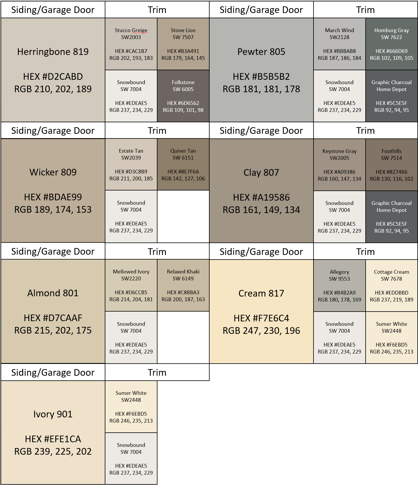The chart below displays the original color schemes and Sherman Williams paint colors for reference. Homes were originally one of the following color schemes, from A to G. Approved trim colors for legacy siding colors are below. Shutter and Doors must match as well.